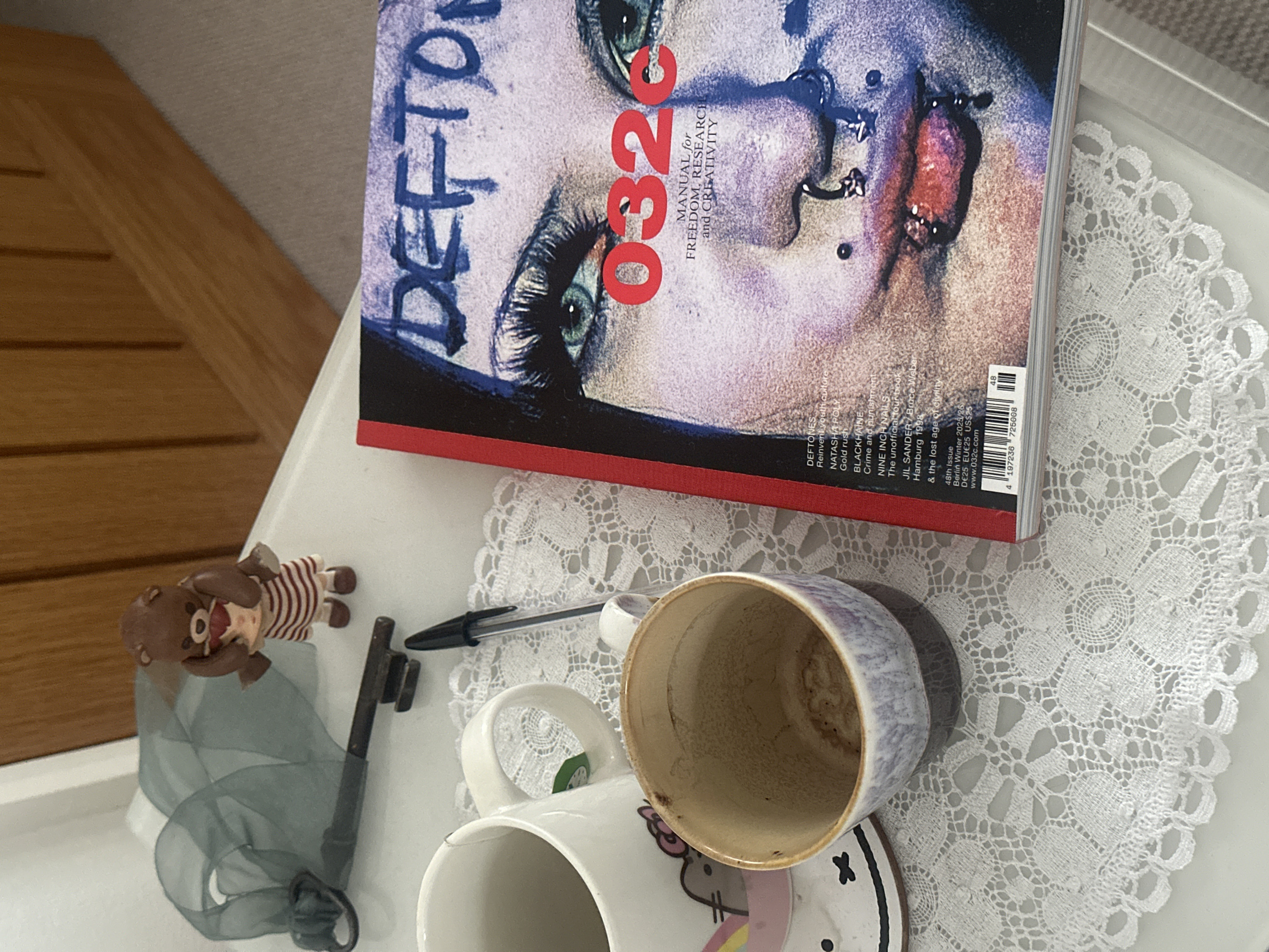 This image depicts an indoor scene in Tunbridge Wells, United Kingdom, captured from an elevated perspective looking down onto a white, lace-covered surface. On the left, a white ceramic mug featuring a "Hello Kitty" design sits on a matching coaster or saucer. Adjacent to it, a smaller, handled ceramic cup, with an internal brown residue, indicates prior use. A black ballpoint pen lies horizontally between these cups and a magazine. In the top left, a crumpled, translucent, dark teal fabric item, possibly an organza bag, rests near a dark, metallic skeleton key. Above the cups, a small brown bear figurine wearing a red and white striped shirt and brown trousers stands upright, holding a red and white striped candy cane. The prominent object on the right is a magazine with a striking red spine. The cover features a close-up of a person's face, with heavily made-up blue-green eyes, dark eyeliner, and multiple facial piercings including a septum ring, nostril studs, and lower lip rings. The word "DEFTONES" is scrawled in blue across the forehead. Large red lettering displays "032c," beneath which "MANUAL for FREEDOM, RESEARCH and CREATIVITY" is printed. Visible text on the cover lists articles such as "DEFTONES Reinvent youth culture" and "NINE INCH NAILS The unofficial tour book." A barcode at the bottom identifies it as the "48th Issue Berlin Winter 2025/26." The background reveals a light brown wooden surface with vertical paneling, possibly a door or wall, and a plain light-colored wall section. The overall arrangement suggests a personal living space. No people are visible.