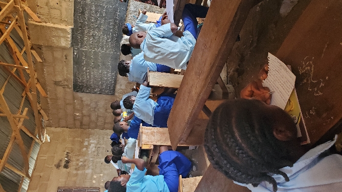 This image displays an active classroom scene inside a building in Akwanga, Nigeria