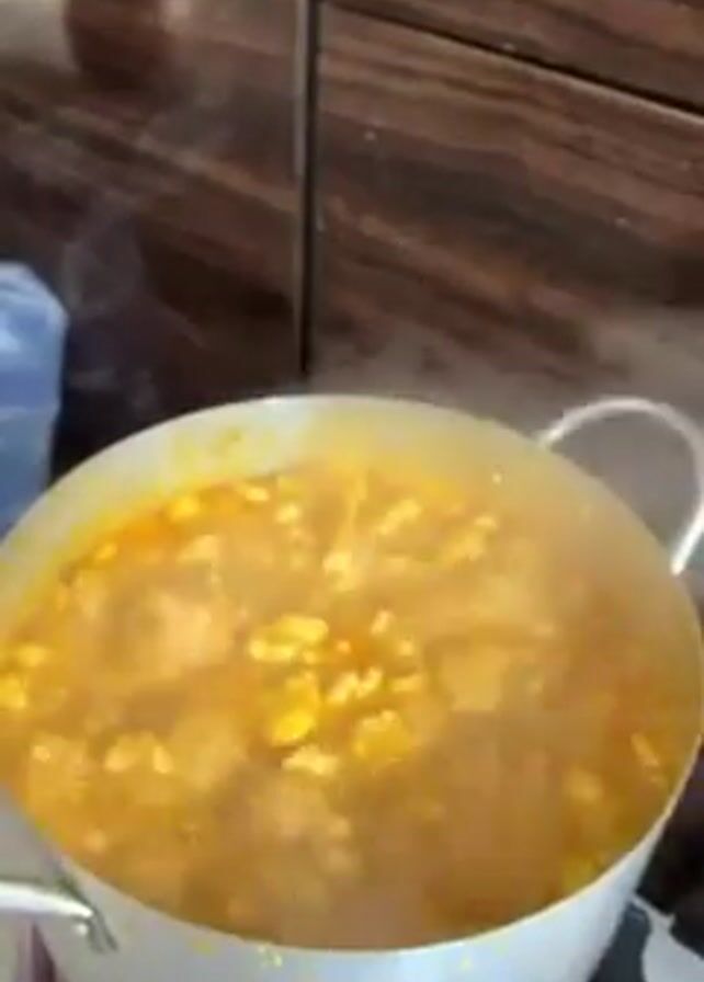 A large silver pot filled with a bubbling, yellow stew-like dish sits on a purple portable gas stove