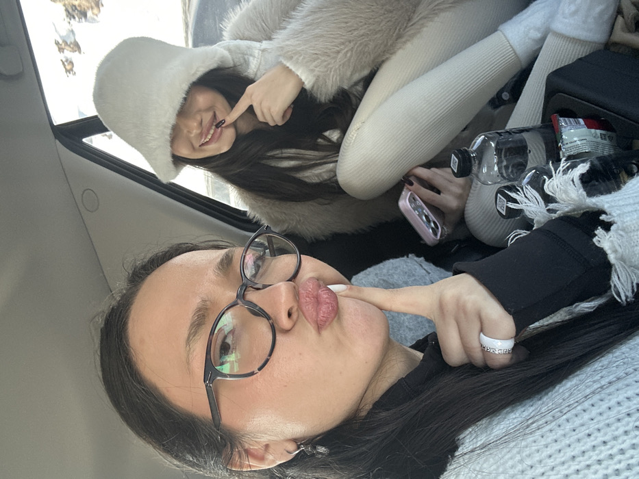 The scene depicts two females inside the passenger compartment of a vehicle, in Jraber, Armenia. The female in the foreground, positioned to the left, has dark hair, wears tortoise-shell glasses, and a light-colored knit sweater over a dark long-sleeved top. She has a white ring on her right ring finger and a small dark earring on her left ear. Her lips are pursed in a "duck face" expression, with her right index finger touching her chin. The female in the background, to the right, has long dark hair mostly covered by a white, fluffy bucket hat that obscures her eyes. She wears a light beige faux-fur coat and light-colored ribbed pants. Her left hand holds a pink smartphone with a patterned case, and her right index finger is pressed against her lower lip, which displays dark lipstick and an apparent smile. Two clear plastic water bottles with black caps and a small red and green packaged snack are visible in a cup holder or tray between the individuals. A fringed, light-colored fabric is also present in the lower center. Through the vehicle's window on the right, a bright, external environment consisting of snowy, mountainous terrain is visible.