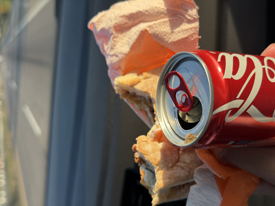 An opened red Coca-Cola can is held at an angle, slightly obscuring a sandwich wrapped in a peach-colored paper