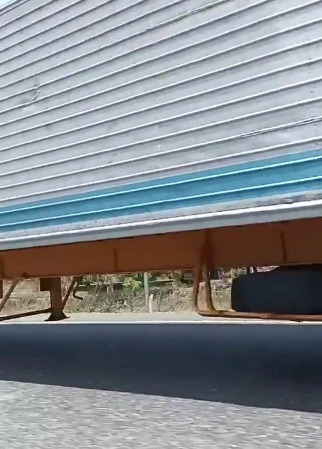 A white and blue tractor-trailer truck drives along a paved road. The side of the truck has horizontal ridges. The truck has a bright yellow chassis and frame. Two pairs of tires are visible on one side of the trailer. The tractor is white and blue, with a dark front bumper. The side of the road has low vegetation and trees. A small building is visible in the distance. The sky is blue with light, puffy clouds. The truck moves quickly past the camera.