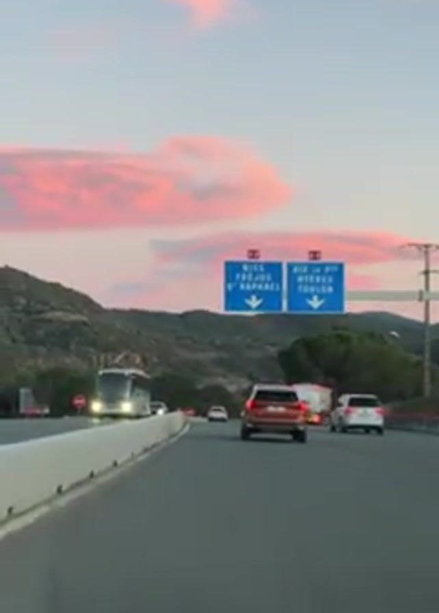 The video depicts a highway scene at dusk. Several vehicles, including a bus and cars, are traveling on the road. Above the lanes, blue signs point directions to Nice, Fréjus, St. Raphael, Aix-en-Provence, Hyères, and Toulon. The sky is pale with pink-tinged clouds. Mountains are visible in the background. The overall impression is of a typical road trip scene during sunset.