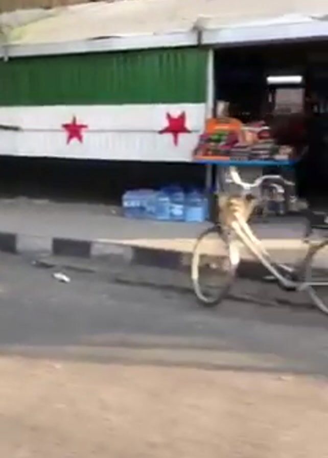street scene in what appears to be Syria, or another location with Syrian flags