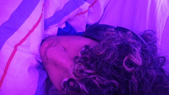 The image depicts an individual resting on a bed in an interior setting. This scene is identified as being in Kamenz - Kamjenc, Germany, though the visual information within the image does not provide external cues to verify this specific city location. The subject's head and upper torso are visible, positioned to the right of the frame and angled downwards, with their face partially resting on the bedding. The individual has dark, curly hair, with subtle reddish tones that are heavily saturated by a dominant purple ambient light source illuminating the entire scene. Distinct facial features, including the nose and lips, are discernible despite the strong lighting, and a light shadow suggests facial hair above the upper lip. A dark garment is visible around the neck area, and a blue fabric is present beneath the head. The bedding consists of a pillow and/or duvet featuring a striped pattern with white, blue, and red lines, all rendered in shades of magenta and violet due to the pervasive purple illumination. The individual appears to be in a state of repose.