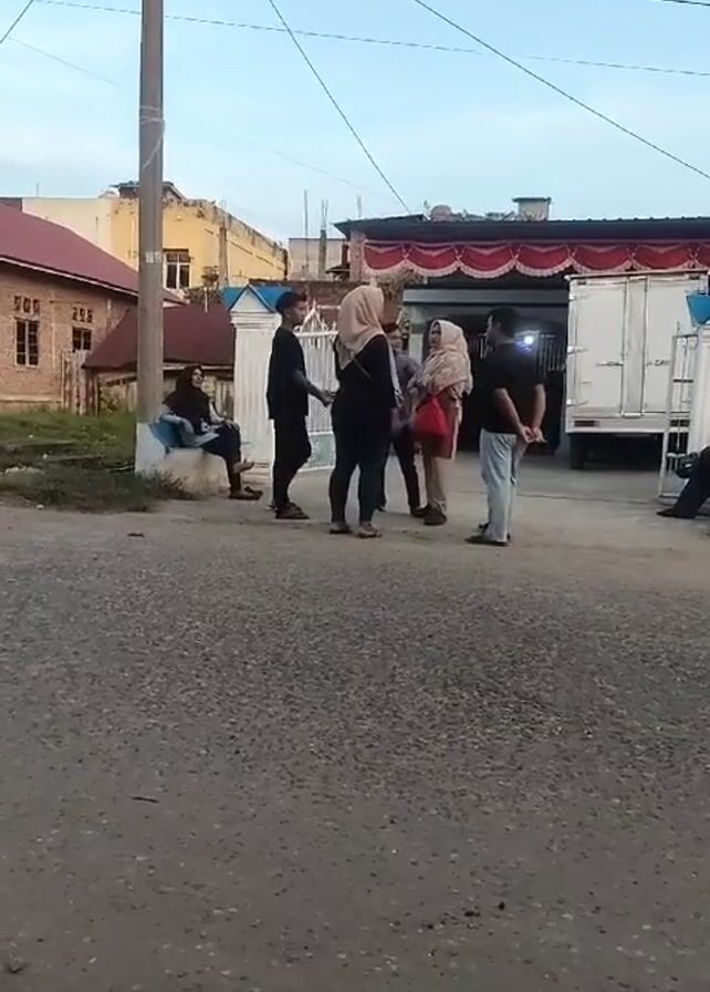 daytime shot of a group of people in an outdoor setting. Several individuals are standing together, some in conversation. There's a man wearing a black shirt and light blue jeans walking toward the camera. He is wearing sandals. In the background, there are buildings, a white truck with red decorations, and utility poles with wires. The ground appears to be an asphalt road. One person is sitting on a concrete block on the side of the road.