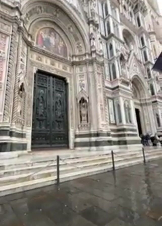 low-angle view of a large ornate building with a grand entrance, likely a cathedral, on a rainy day