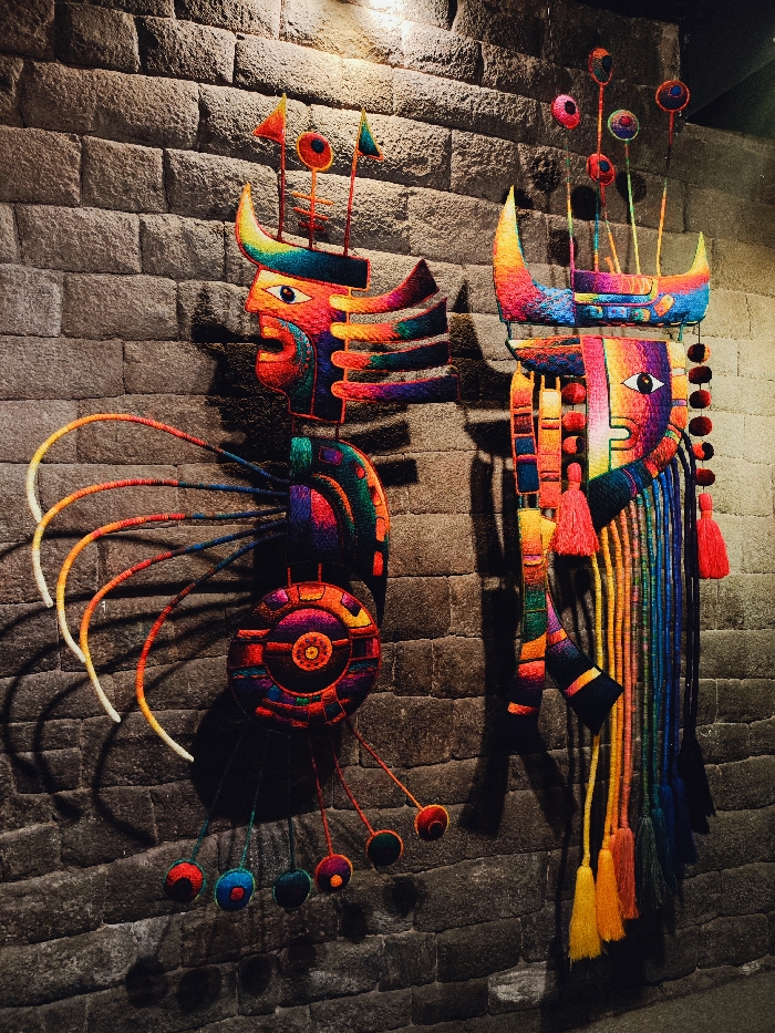 Two vibrantly colored, intricate textile and mixed-media artworks are displayed against a dry-stacked stone wall, characteristic of traditional Inca or colonial architecture in Cuzco, Peru
