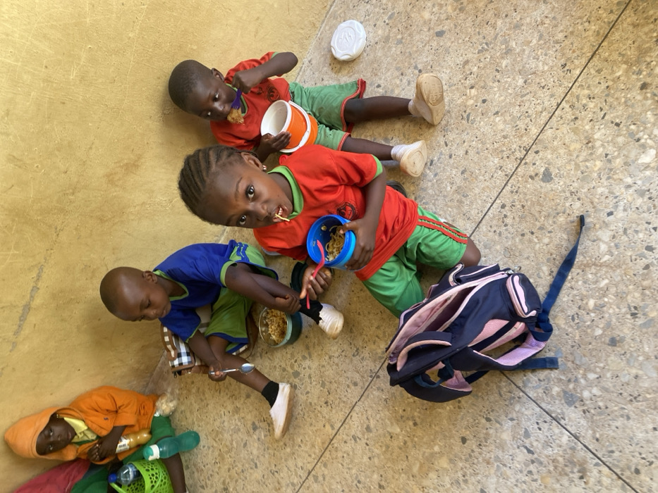 Five children are seated on a light brown and grey speckled tiled floor against a plain light beige wall in Akwanga, Nigeria. From left to right: A child in an orange hooded top and green pants sits with a green woven basket containing a blue water bottle and an orange-liquid bottle. Next, a child in a blue shirt and green shorts holds a silver spoon over a small black bowl of light-colored food, wearing white shoes. In the foreground, a child with braided hair, wearing a red shirt with a green collar and green shorts, looks directly at the camera while holding a blue bowl with spaghetti-like food and a pink utensil. A dark blue and pink backpack rests on the floor beside this child. To the right, a child in a red shirt and green shorts holds an orange and white container, eating food with a green utensil. A white round container lid is on the floor nearby. The legs and feet of a fifth child are partially visible next to the fourth child. All children are engaged in eating.