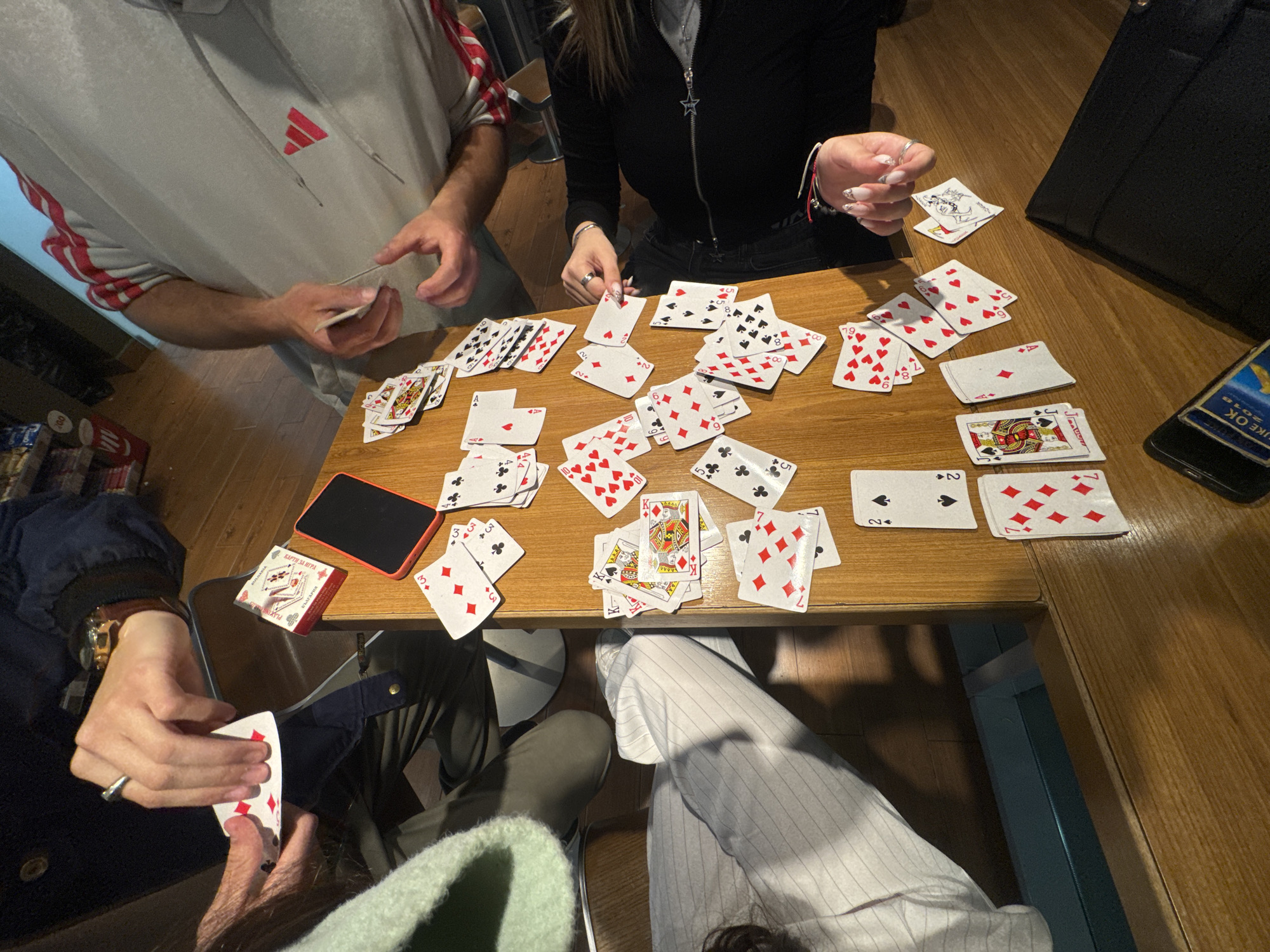 four people gathered around a wooden table playing cards. The table is cluttered with scattered playing cards. On the table are a deck of cards and a phone. The people are holding cards in their hands. One person is wearing a gray Adidas hoodie. Another person is wearing a black jacket. A third person is wearing a blue jacket. The location is Polikraishte, Bulgaria.