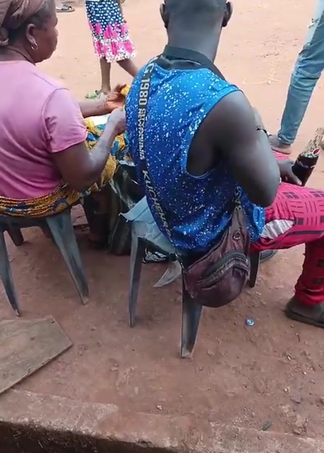 The video depicts an outdoor scene with a woman braiding a man's hair. The woman, wearing a pink top and a headwrap, sits on a black plastic chair while braiding the hair of a man sitting next to her. The man wears a blue sleeveless shirt, red patterned pants, and black sandals. A brown fanny pack is slung over his shoulder. He holds a glass bottle of soda in his right hand. They sit on black plastic chairs on a dirt-covered ground. A wooden board sits on the ground next to the woman. In the background, other people walk around, and several motorcycles are parked. There are hints of buildings and other structures in the distance. The environment appears to be a casual, possibly rural or semi-urban outdoor setting.