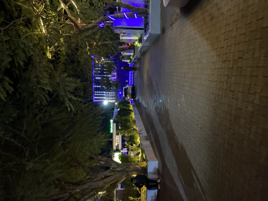 A lit walkway curves into the distance at night. Trees with lights line the left, and buildings are adorned with blue and green lights further back. A car is parked along the path, and at least two figures are visible: one walking near the car and another seated near the bottom of the frame. The walkway surface is textured, appearing to be brick or stone.