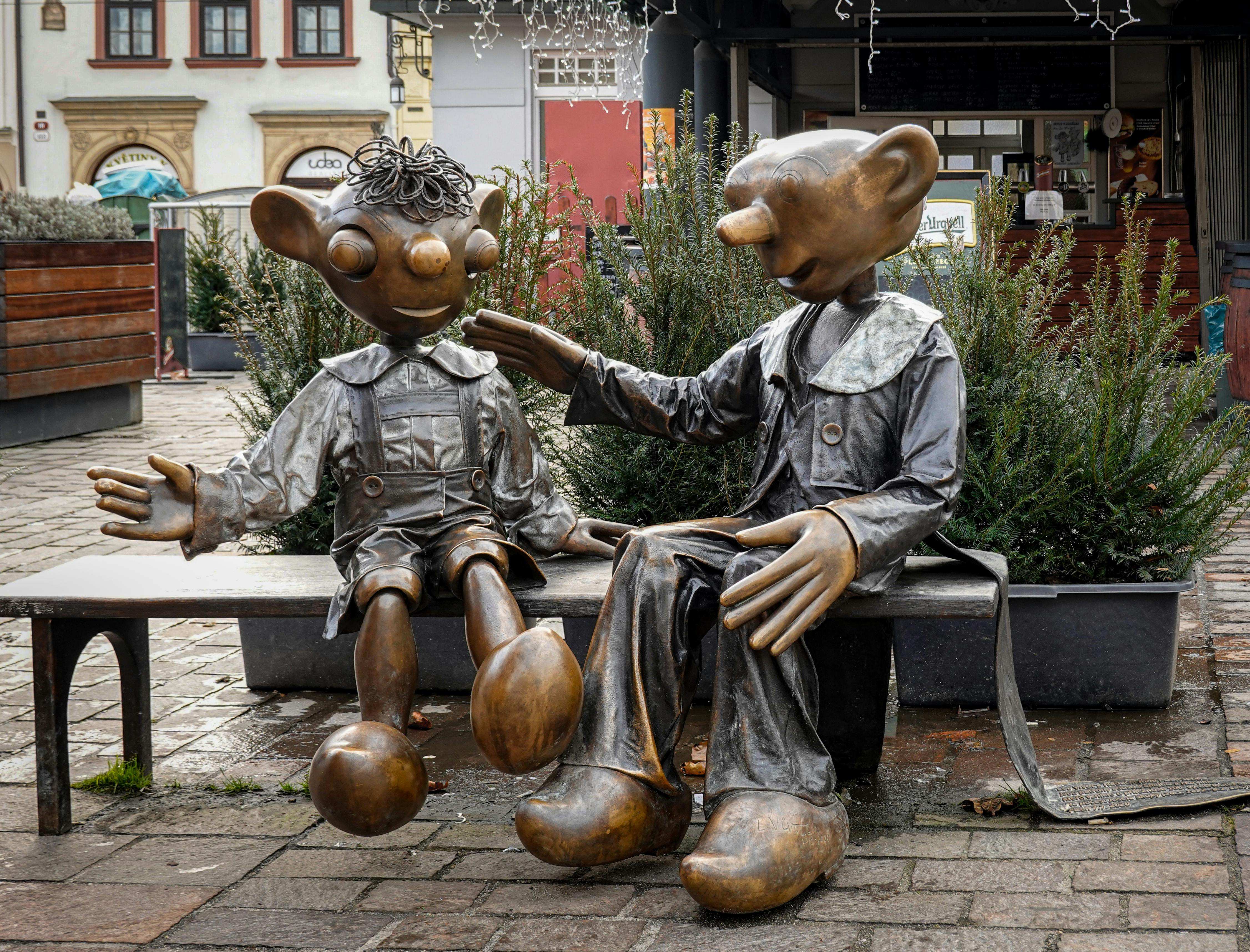 - "Two bronze sculptures of human figures are seated on a bench together" by FM-ZLnvp1, licensed under CC BY 4.0