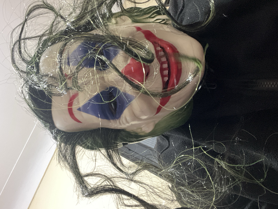 - "A clown mask with green and black hair is seen at an angle" by FM-HpdTa2, licensed under CC BY 4.0