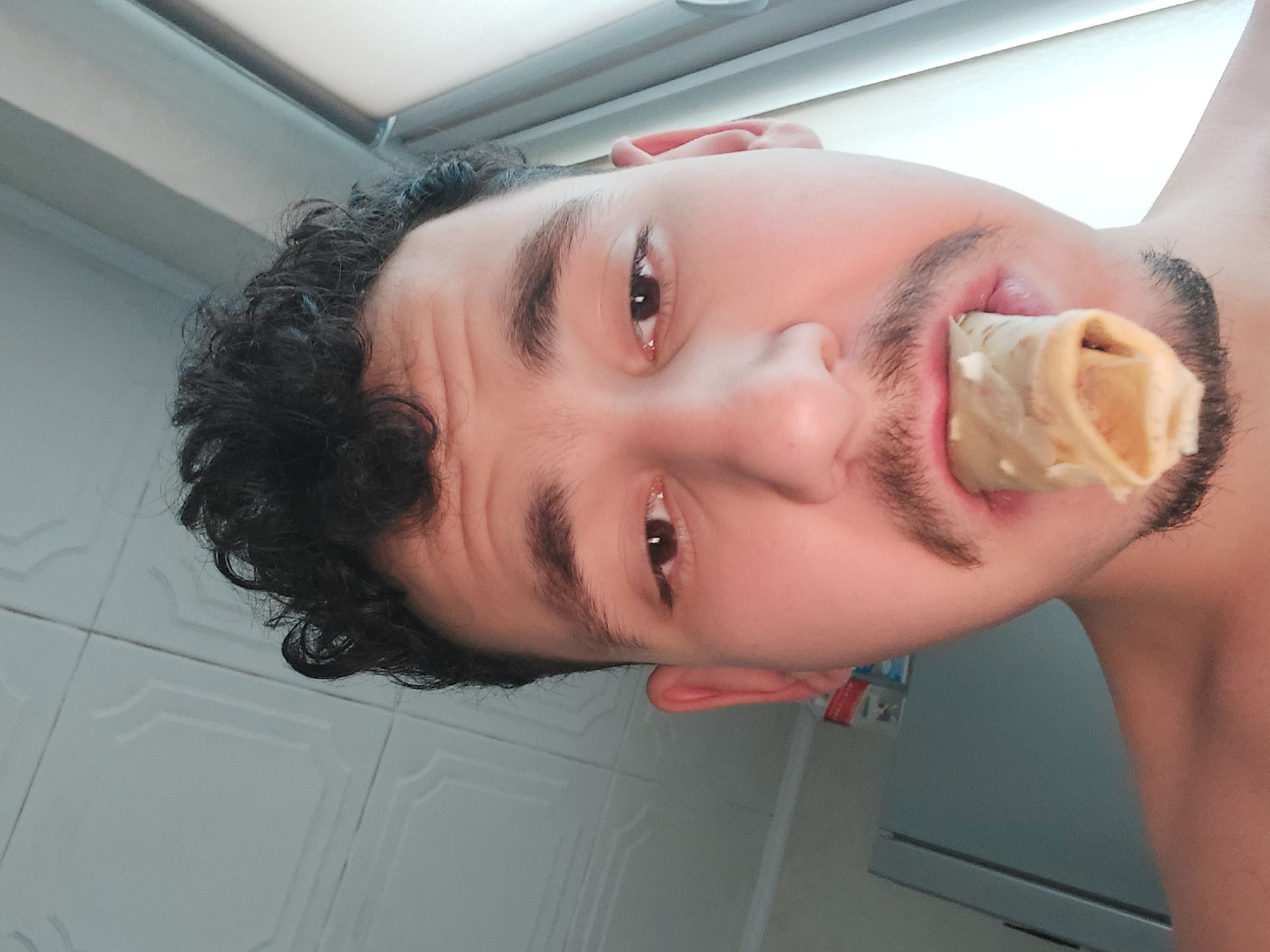 A close-up, head-and-shoulder portrait depicts a young adult male in an indoor setting within Gorna Oryahovitsa, Bulgaria. The subject has dark, curly hair, a mustache, and a short beard. He is shirtless and positioned slightly to the left of the frame, looking downward towards the camera. A light-colored, rolled food item, resembling a pancake or crepe, is partially inserted into his open mouth. The background to the upper left features a white ceiling with a decorative patterned tile or panel design. Below the ceiling on the left, a portion of a light blue-grey refrigerator is visible, with faint red and white elements attached to its side. To the right, a vertical, light-colored structure consistent with a window or door frame is present.