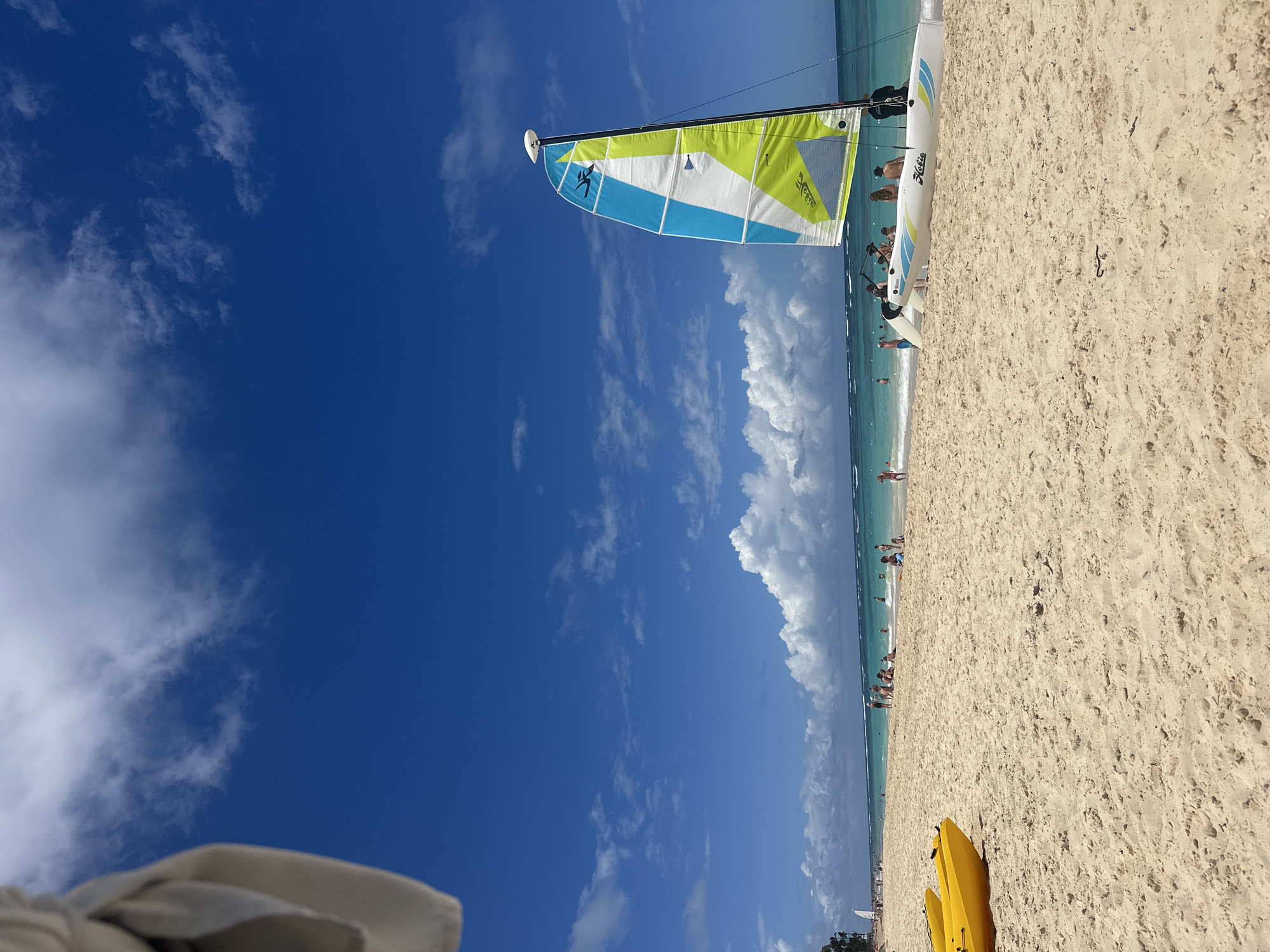 This image displays a daytime beach scene located in a coastal area of Higüey, Dominican Republic. The sky is bright blue with scattered white cumulus clouds. A broad expanse of light-colored sand dominates the foreground. Two yellow kayaks are partially visible on the sand at the far left. A beige fabric object partially obstructs the upper left quadrant of the sky. A white Hobie Cat catamaran, featuring a blue, white, and lime green sail with a white, dome-shaped object at the mast's apex, is beached on the sand in the mid-right. Approximately eight individuals are positioned around the catamaran, some standing in the shallow water, others on the sand. Numerous other people are dispersed along the extensive sandy beach and within the turquoise ocean waters, either wading or swimming. Small waves break near the shore, and a distant line of white surf is visible. Several small boats are present on the horizon, and palm trees line the distant left shoreline. The scene is illuminated by natural daylight.