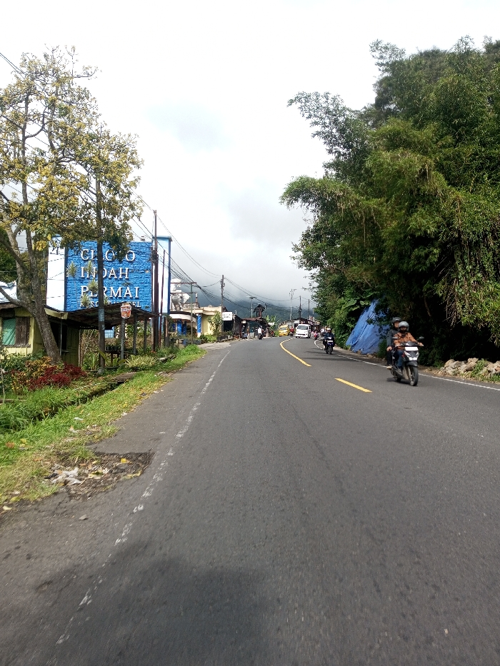 The image depicts a daytime view of an asphalt road curving slightly right, under an overcast sky, in a location identified as Saing Ta Mawt Lay, Myanmar. On the left side of the road, a large blue sign with white text, partially obscured by a tree with light green foliage, reads "CICO INDAH PERMAI Resort & Hotel." Behind this sign and further along the left roadside are several modest, single-story structures, including a building with light-colored walls, with overhead power lines. The immediate left foreground shows a grassy verge and a small drainage ditch. The right side of the road features a steep embankment densely covered in green bamboo and other tropical vegetation, with a blue tarp visible within the foliage. The two-lane road has a faded white line marking its right edge and a prominent yellow center line that transitions to a double yellow line further into the distance. Traffic primarily consists of motorcycles moving away from the viewer. A dark motorcycle in the right lane carries two helmeted riders in the foreground. Further down the road, at least two additional motorcycles and a white van are visible. In the background, distant, dark, forested mountains are partially obscured by atmospheric haze or clouds. The sky is uniformly white and overcast.