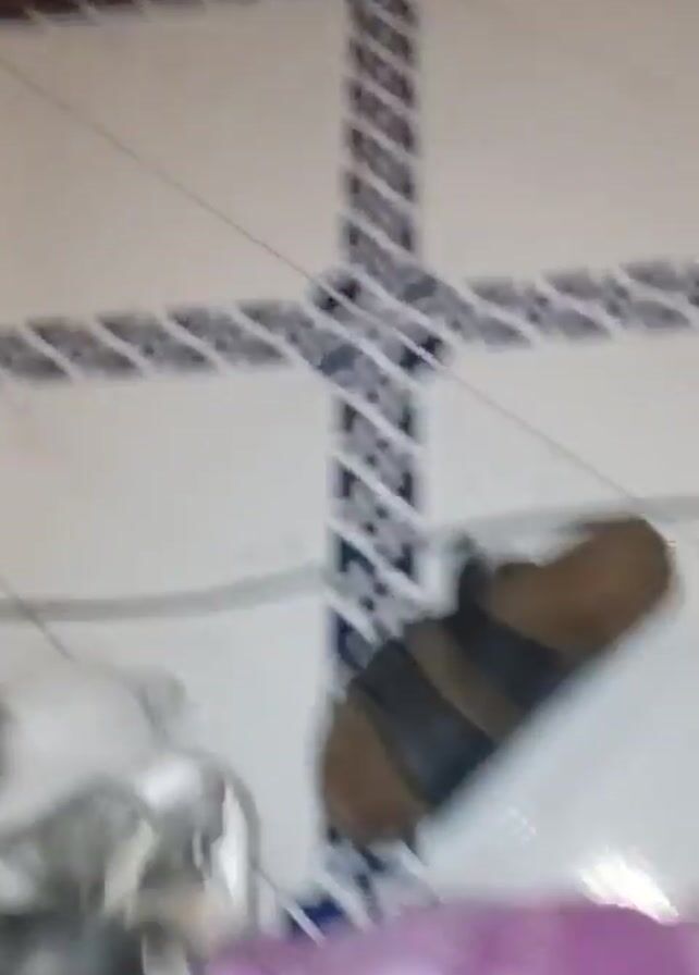 fluffy cat investigating a brown sandal on a tiled floor. The floor has white tiles with a blue geometric pattern where the tiles meet. The cat, which is primarily gray and white, sniffs and paws at the sandal. Part of a pink blanket is visible in the foreground. In the upper left corner, a portion of what appears to be a patterned sofa is visible. A black cable is also on the floor, running under the sandal. The cat moves around the sandal, exploring it with its paws.