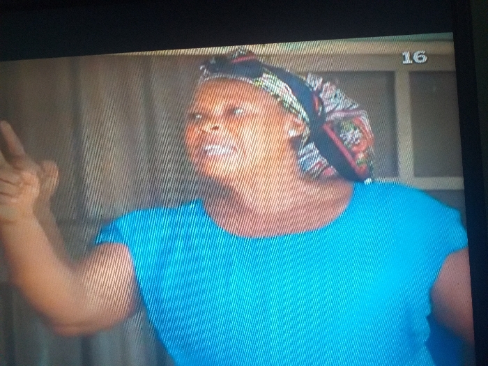 In the city of Masaka, Nigeria, a medium-shot image captures an adult female from the chest up, actively engaged in an indoor or shaded outdoor setting. She has dark skin and is wearing a short-sleeved, scoop-neck blue top. Her head is covered by a patterned fabric headwrap, predominantly featuring red, black, green, and white motifs. The female is positioned slightly off-center, facing towards the right side of the frame, with her mouth partially open, suggesting she is speaking or vocalizing. Her right arm is raised, with the index finger extended upward and the remaining fingers forming a fist, indicating an emphatic gesture. The background consists of vertically striated, light brown textures, possibly a wall or curtain, with a horizontal demarcation line visible in the upper portion. In the upper right corner, the number "16" is displayed, superimposed on the image.