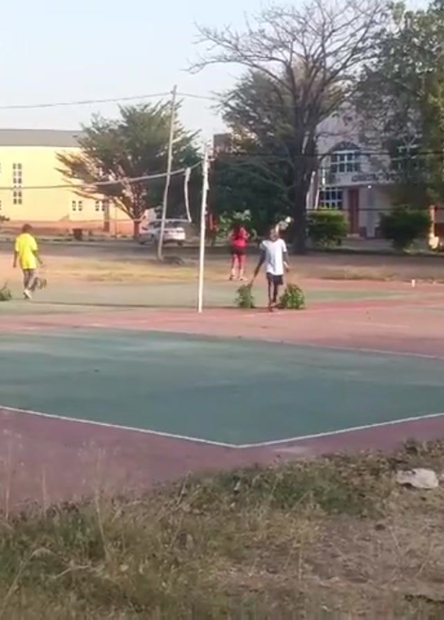 group of people cleaning a volleyball court. Several individuals are using sticks to sweep leaves and debris off the court's surface. The court is green with white lines, and a net is stretched across the middle. In the background, there's a multi-story building with many windows. Trees surround the area, and the sky is light with sunlight. A man in a gray shirt and light pants is walking near the edge of the court. There's a bag on the ground near him. Other people are walking in the background. Overall, the scene depicts a community effort to maintain a recreational space.
