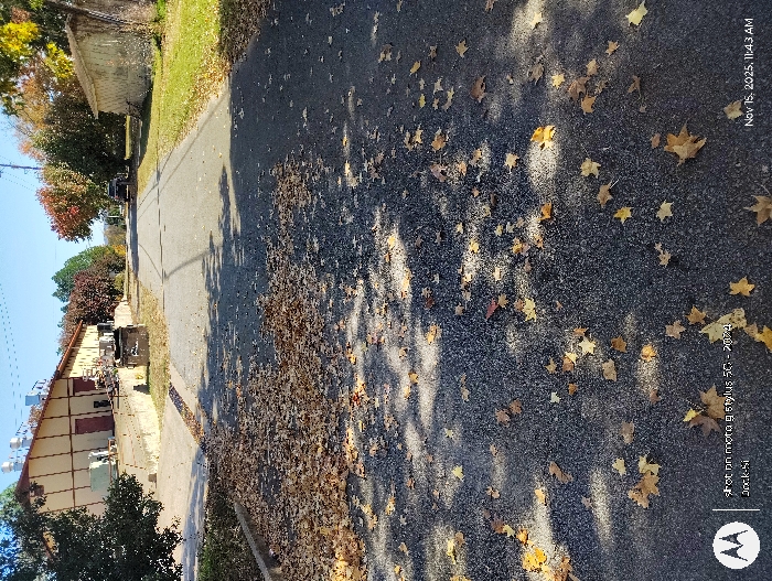 The photo shows a street covered in fallen leaves. Sunlight filters through trees, casting shadows on the asphalt. A building with a distinct architectural style is visible on the left side of the street, partially obscured by trees. The sky is a clear blue. The photo was taken with a Moto G Stylus 5G on November 15, 2025, at 11:43 AM by Jock-Si.