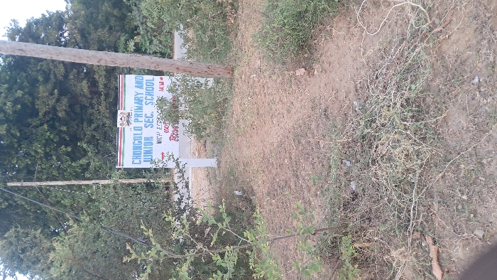 Choncolo Primary and Junior Secondary School sign partly hidden by shrubs. The sign is white with a green border and black lettering, positioned beside a utility pole. The surrounding area is a dry, dirt landscape with scattered vegetation. Trees are visible in the background. The image is taken from a low angle, partially obscured by plant life in the foreground.