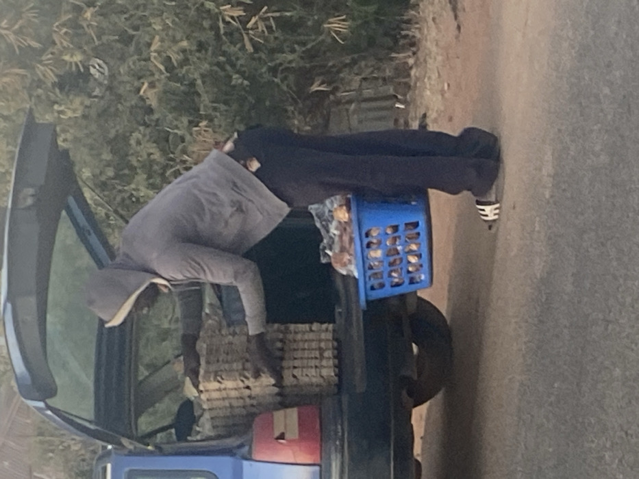 A person in a grey hoodie and black pants is leaning into the open trunk of a blue vehicle. The trunk appears to be filled with numerous egg cartons. A blue plastic basket containing packaged food items is perched on the vehicle's rear. The person seems to be organizing or retrieving something from the trunk's contents. The vehicle is parked on the side of a road with vegetation visible in the background.