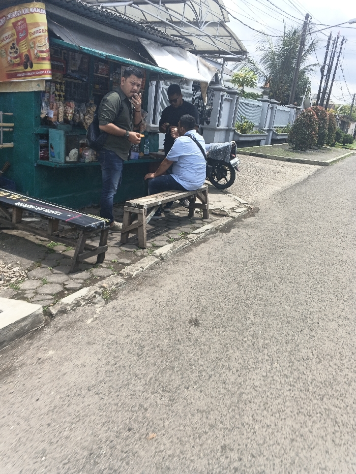 Three men are congregated outside a small, open-fronted shop or stall. One man, wearing a green shirt and jeans, stands at the counter smoking. Another man in black stands beside him. A third man, dressed in a light blue shirt, is seated on a wooden bench. A parked motorcycle is behind them. The scene is set on a street or roadside, with a pavement and buildings visible in the background.