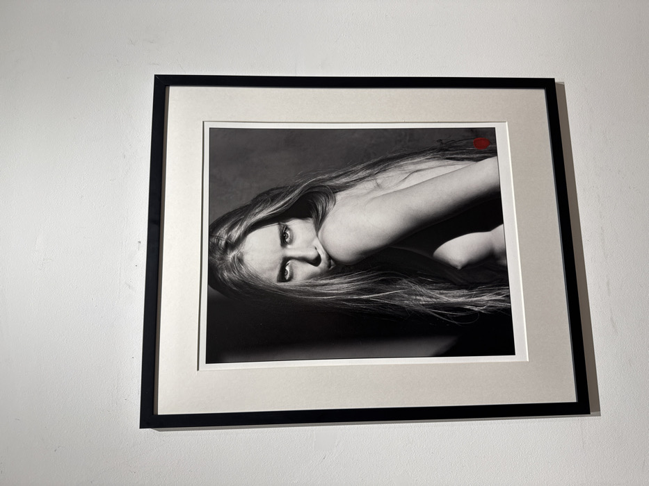 The image displays a black-framed, matted black and white photographic print mounted on a textured white wall in Lviv, Ukraine. The photograph features a young adult female subject with long, straight light-colored hair, positioned to look directly at the viewer over her left shoulder. She exhibits an intense, serious expression. The subject is depicted partially nude, with her bare shoulders and upper torso visible. The lighting creates a high-contrast chiaroscuro effect, casting significant shadows on the right side of her face and body. A distinct red circular mark is visible in the bottom right corner of the photographic print itself, above the matting. The environment is an indoor setting consistent with an art gallery or exhibition space.