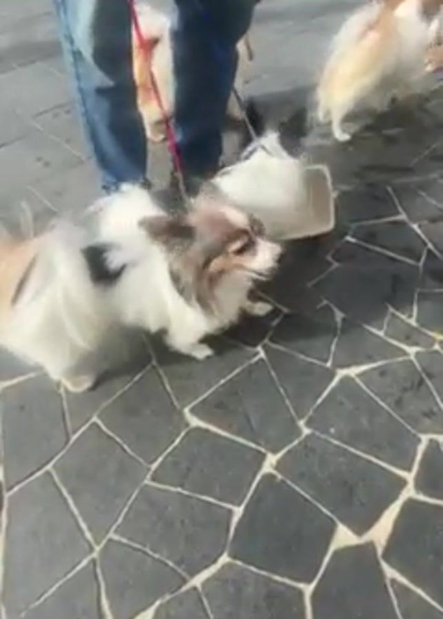 The scene shows several people holding leashes attached to small dogs on a paved walkway. The dogs appear to be mostly Papillons. A white styrofoam container lies on the ground in front of one dog who is interacting with it. The pavement has a tessellated pattern of dark grey stones. In the background, blurry figures and scooters can be seen. The setting appears to be a public space, possibly a pedestrian area.