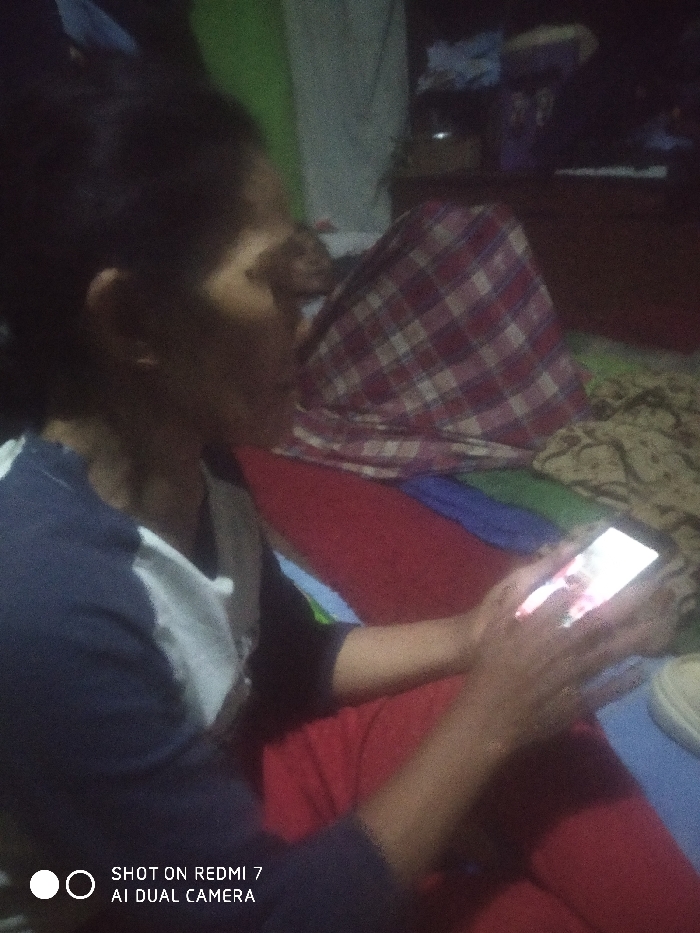 The image depicts an indoor scene in Lamajang, Indonesia, under dim lighting. In the foreground, a person is seated or reclining, visible from the chest upwards in a right-profile view. This individual is wearing a dark blue and white long-sleeved shirt and is actively holding a white-backed smartphone with both hands. The smartphone screen is illuminated, displaying an image that appears to be a person or a face. The person's lower body is covered by a red fabric, possibly pants or a blanket. In the mid-ground, behind the foreground individual, another person is partially visible, largely covered by a red and white plaid blanket. This individual appears to be reclining or lying down. Various textile layers are present in the immediate environment, including a red fabric beneath the foreground person, a blue fabric layer, and a beige-patterned fabric on the right side of the frame. The background is dark and indistinct, showing vague outlines of furniture or shelves containing various dark objects. A vertical green surface is partially visible on the far left. A watermark stating "SHOT ON REDMI 7 AI DUAL CAMERA" is present in the lower-left corner of the image.