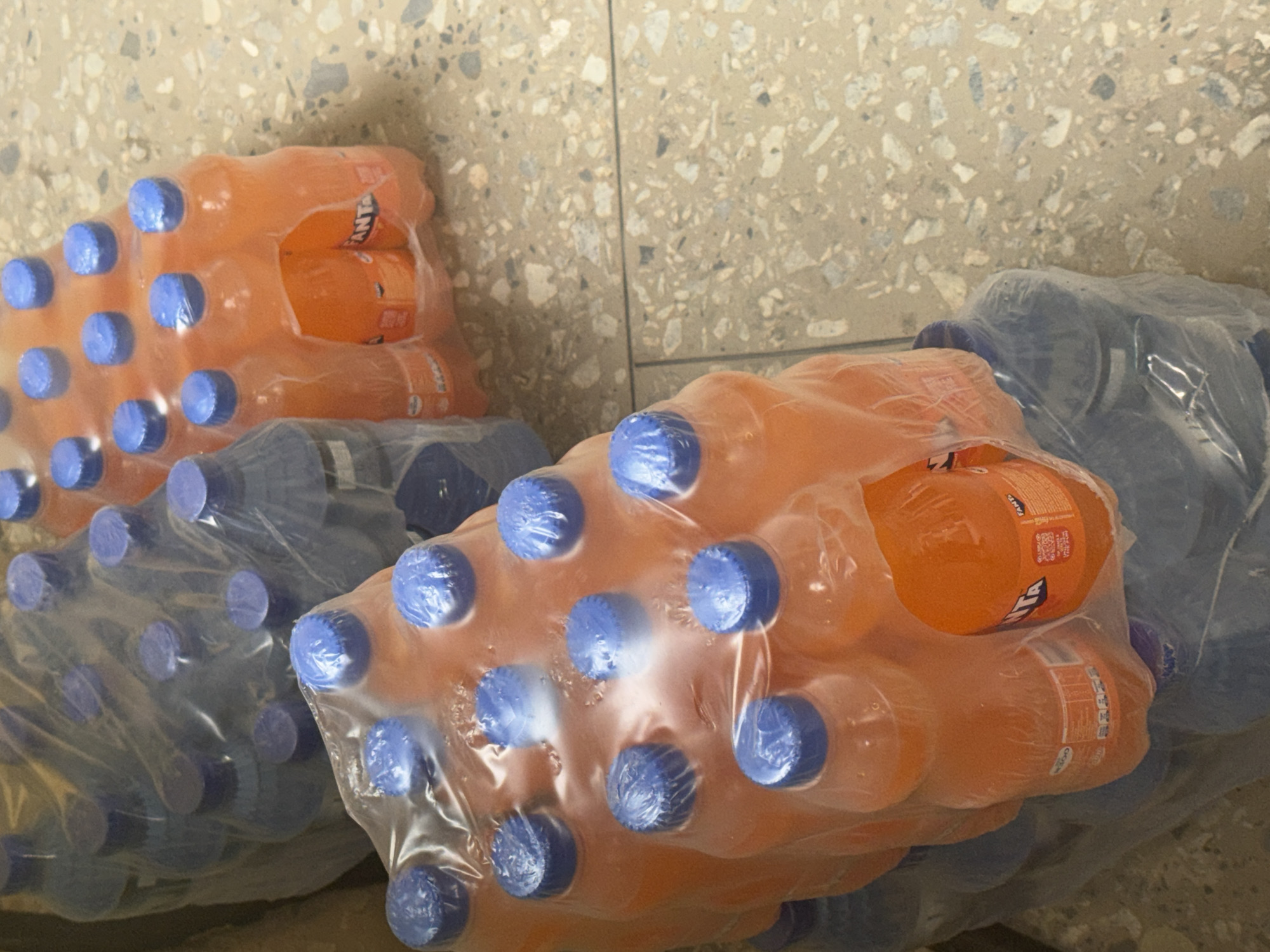 The image depicts two bundles of Fanta orange soda bottles and two bundles of blue-colored liquid bottles, all shrink-wrapped in clear plastic
