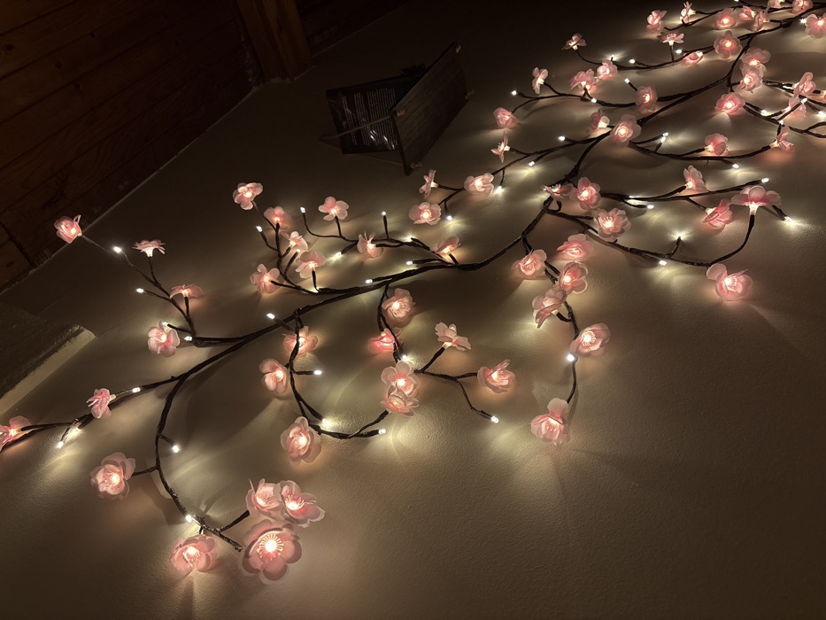 The image displays an indoor wall decorated with a permanent or semi-permanent illuminated floral arrangement, located in Varna, Bulgaria. The primary subject is a dark, artificial branch-like structure adorned with numerous small, warm-white LED lights. Interspersed along these branches are light-pink, translucent fabric flowers, each individually illuminated from within by a concealed LED. This decorative element is affixed to a light beige-colored wall, creating a warm glow. In the upper right quadrant of the image, a dark wooden sloped ceiling or structural beam is visible. Below this wooden element, a small, rustic wooden shelf, suspended by two dark cords, is mounted on the wall. A dark, rectangular object, possibly a book or plaque, rests on this shelf. The scene is illuminated predominantly by the decorative lights, suggesting a low ambient light environment. No individuals, actions, or interactions are present.