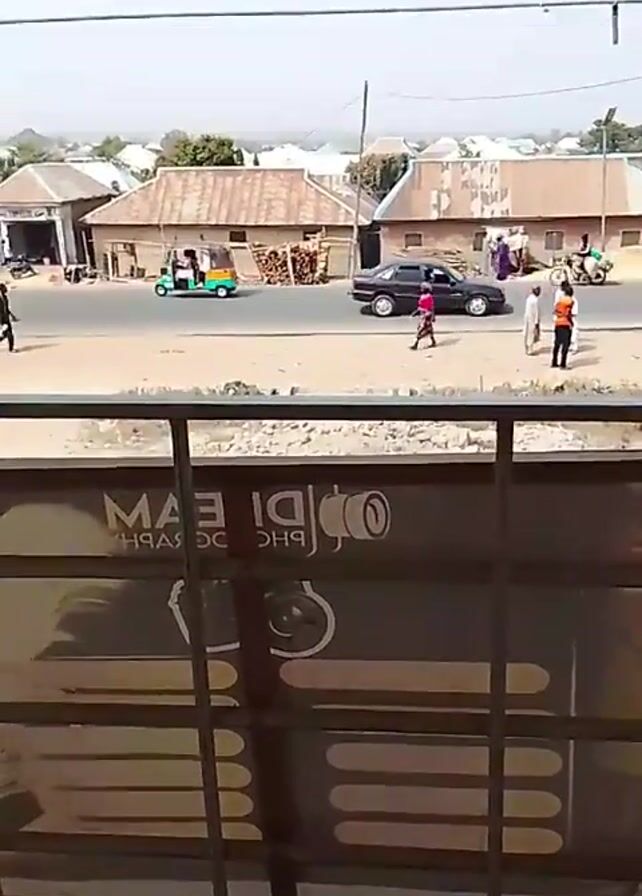 street scene in what appears to be a small town or village. The shot is taken from an elevated perspective, looking out over a street intersection. There are several small buildings with corrugated metal roofs lining the street. A few people are walking along the side of the road, and there are also a few vehicles, including a black car and a small, three-wheeled vehicle that looks like an auto-rickshaw. The sky is overcast, and the overall impression is of a dusty and somewhat impoverished area. In the foreground, the railing of a balcony or window is visible, partially obscuring the view. A sign with the words "MAI TEAM PHOTOGRAPH" is also visible, suggesting the location may be related to a photography business.