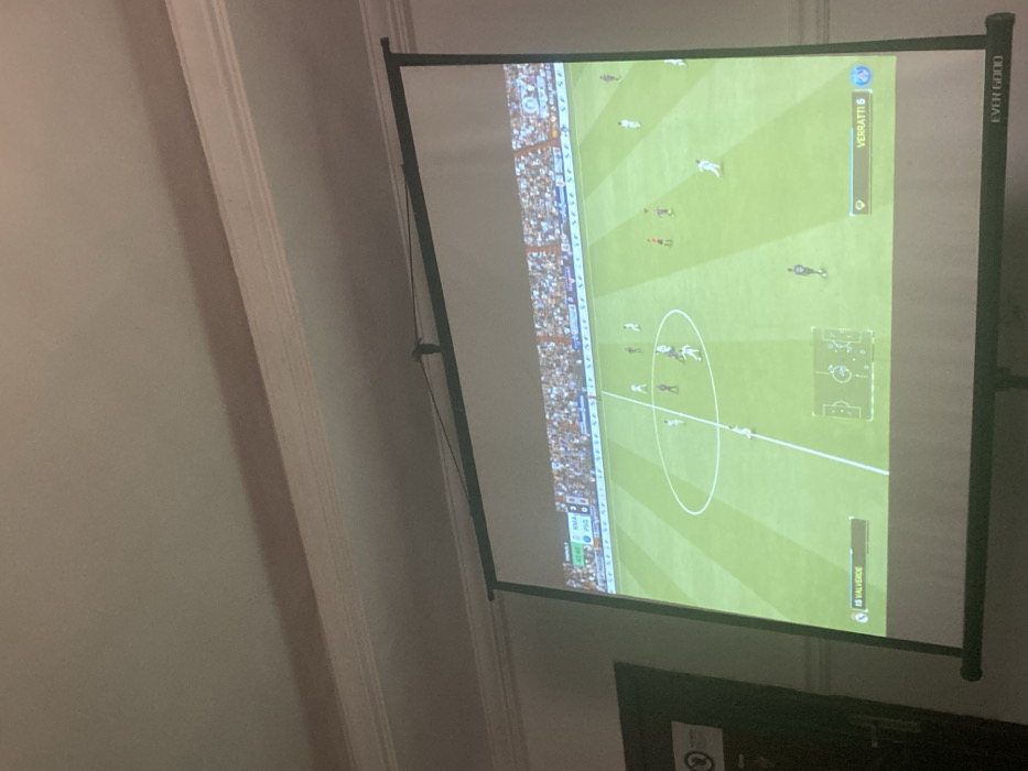The scene, set in Narayi, Nigeria, depicts an indoor environment focused on a large, wall-mounted projector screen. The white, retractable screen, with a black border and "EVER 6000" printed on its lower right frame, displays a football (soccer) video game. The projected image shows a virtual green pitch with white markings, populated by multiple virtual players in white and dark-colored kits, observed from an elevated perspective. Virtual stadium stands filled with spectators are visible in the background of the game. On-screen graphical overlays include a scoreboard displaying "RMA 0 PSG 0" and a game time of "0:01," along with player identifiers "15 VALVERDE" on the bottom left and "VERRATTI 6" on the bottom right. A mini-map of the pitch is also present near the bottom center. Above the screen, a light-colored ceiling with decorative coving is visible, from which a projector mount and connecting wire extend towards the top of the screen. A portion of a dark-colored doorway is visible on the far left. No actual people are present in the room's physical environment.