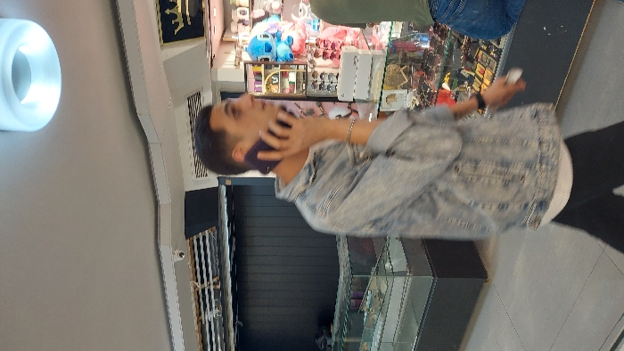 An indoor commercial area in Barza Municipality, Syria, displays multiple retail storefronts. The foreground features a young adult male, of apparent Middle Eastern descent, with short dark hair, wearing a light blue denim jacket over a white undershirt, and dark pants. He is in motion, walking from left to right, holding a dark-colored smartphone to his right ear, engaged in a conversation. A silver-colored bracelet adorns his right wrist and a dark watch his left. His gaze is directed towards the right. To his immediate right, a partial view of another individual wearing a green shirt and blue jeans is visible next to a brightly lit display case containing sunglasses, accessories, and a blue Stitch character plush toy. Further left, another dark-based glass display case is visible. The ceiling is white with integrated lighting, including a prominent circular LED fixture, and a security camera (CCTV) is mounted overhead. The flooring is light-colored tile.