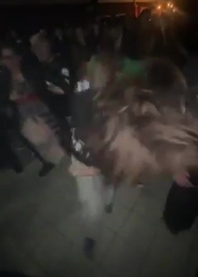 group of people moshing or slam dancing at an outdoor event. The people are a mix of genders and are dressed in casual clothing. The light is dim, but there is a building visible in the background with string lights. The floor is tiled.