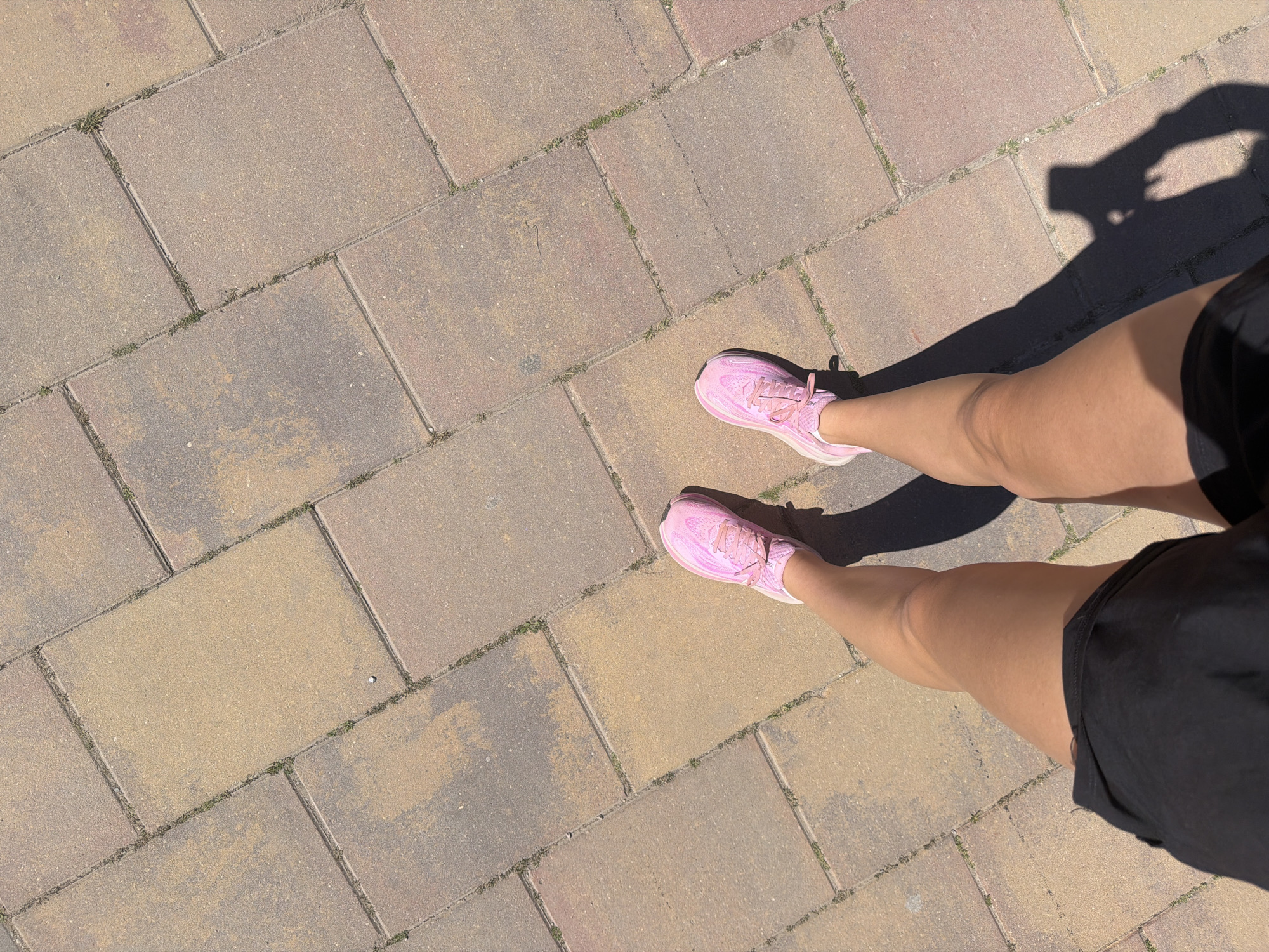 The image displays a first-person, downward view of an individual's lower legs and feet. The subject is wearing light pink athletic shoes with white soles and partially visible black shorts. The skin on the exposed legs is tanned. The individual is standing on an outdoor paved surface composed of rectangular interlocking concrete pavers, which exhibit varying shades of brown, tan, and reddish-brown. Small amounts of green vegetation are visible growing within the seams between the pavers. The scene is brightly illuminated by direct sunlight, casting distinct shadows, including the discernible shadow of the person holding the camera in the lower right quadrant of the frame. The setting is within the city of Valencia, Spain; however, the precise location within the city cannot be determined from the visual information provided.