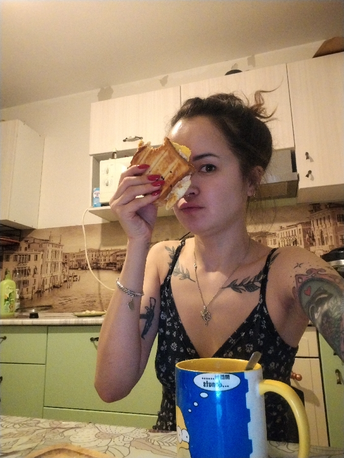 A woman with dark hair in a messy bun holds a half-eaten sandwich to her eye. She has a nose ring, various arm tattoos, and a leaf tattoo on her chest. She wears a black dress with thin straps. A blue mug with yellow trim sits in front of her. The background shows kitchen cabinets, a microwave, and a wallpaper backsplash of a European city.