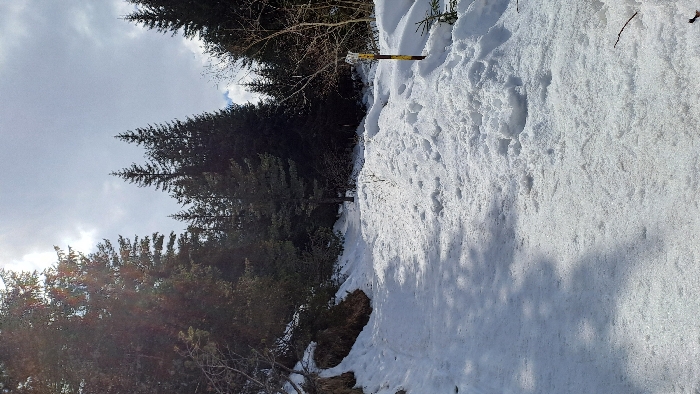 The image depicts a snow-covered forest path ascending into a dense conifer forest located in Govedartsi, Bulgaria. The path occupies the center and lower left of the frame, showing compacted snow with visible foot impressions and shadows from overhead trees. Deeper snow accumulates on either side of the path, forming banks. Tall, dark evergreen trees, primarily conifers, line both sides of the path, extending upwards and obscuring portions of the sky. The sky above is partly cloudy, with bright sunlight visible through gaps in the cloud cover and illuminating the treetops on the left. On the right side of the path, a yellow and black striped marker post is partially buried in the snow. Bare deciduous branches and some small icicles are visible on the right foreground. No individuals or animals are present.