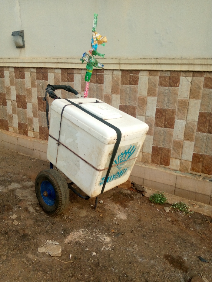 A white, rectangular cooler on a two-wheeled cart sits outside a tiled building. The cooler, labeled "FAN" in blue, is secured with black straps and thin rope. A tall stick adorned with colorful plastic scraps rises from the top of the cooler. The ground is dirt and debris, with a small patch of greenery near the building's base. A light fixture is visible on the wall above the tiled section.