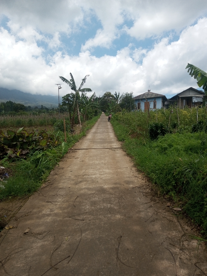 This image depicts a rural scene in Bagochen Boolingpang Ueling, Bhutan. A straight, grey concrete pathway extends from the foreground into the background, narrowing with perspective. The path is marked with horizontal expansion joints and scattered with dark, curved plant debris. To the left of the path, dense green foliage, including broad-leafed plants, borders cultivated fields that stretch towards distant, cloud-covered mountains. Several banana trees and a tall street light with a solar panel are visible on the left side. To the right, cultivated green plants in rows, supported by stakes, lead to two residential structures: a light blue building with a distinct domed roof and dark window frames, and a simpler house with a dark roof positioned further back. A dark-colored scooter or motorcycle is parked on the right edge of the path in the midground, facing away from the viewer. A single, indistinct human figure is visible walking away in the far distance on the path. The sky above is partially overcast with white and grey clouds, revealing patches of blue.