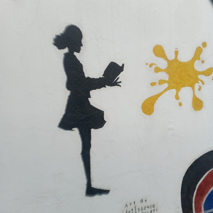 The image displays a stencil graffiti artwork on a white, textured wall in Lagos, Nigeria. The primary subject is a black silhouette of a female figure, seen in profile and facing to the right. She has hair gathered at the back and is depicted wearing a skirt or dress. The figure holds an open book with both hands, appearing to read it. To the right of the silhouette, a yellow paint splat design is prominently featured. In the lower right corner of the frame, a partial circular motif is visible, comprising concentric bands of black, red, and blue. Below the central figure, faint handwritten text reads "Art By ArtEssence" followed by a partial phone number, "09056271." The specific street address within Lagos is not discernible from the image.