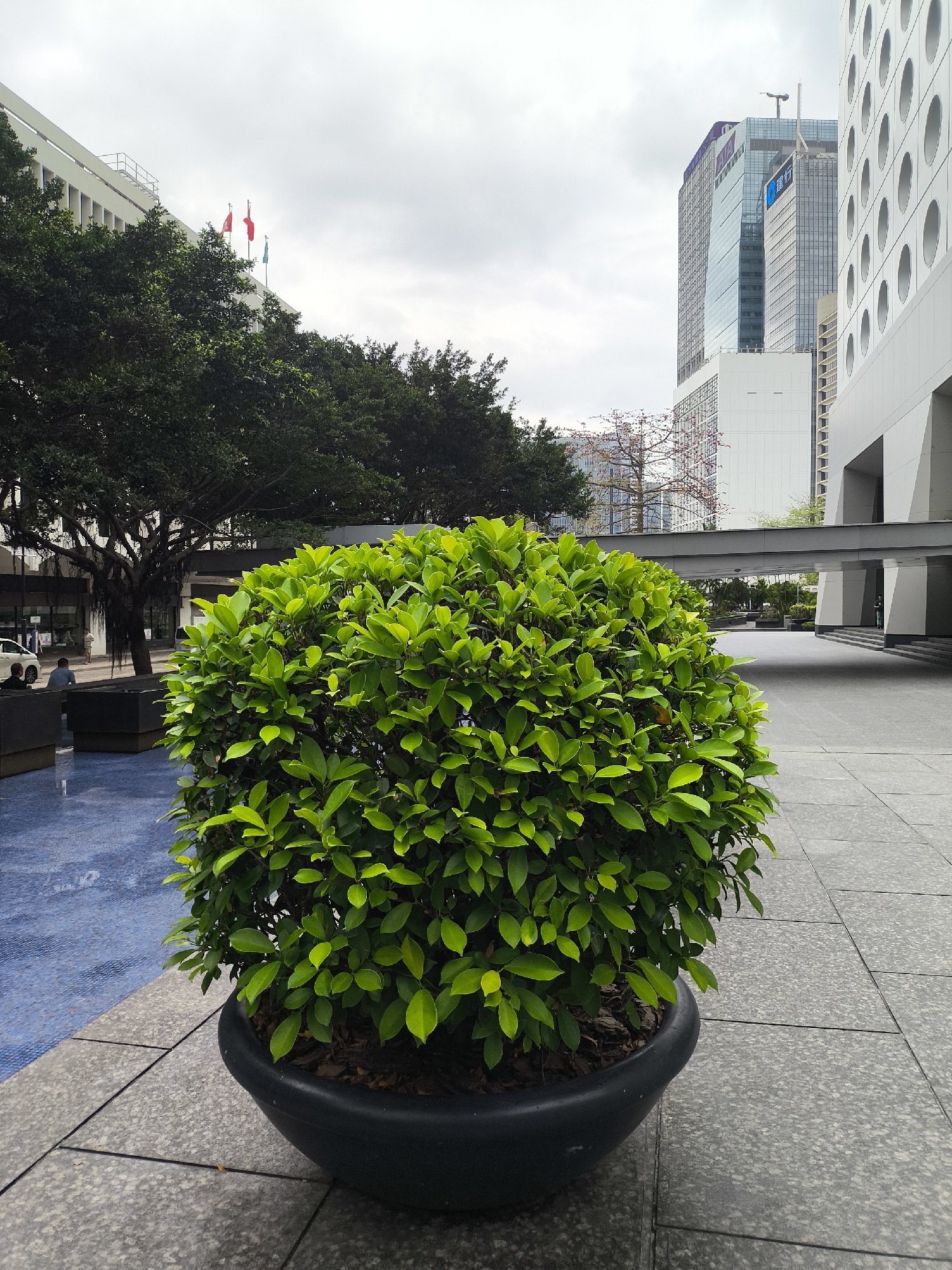The scene depicts an urban plaza in the Central district of Hong Kong, China, under an overcast sky. In the foreground, a large, spherical, dark green potted plant is centrally positioned within a black, bowl-shaped planter. The ground is paved with light grey, speckled square tiles. To the immediate left, a section of a blue-tiled surface, indicative of a decorative water feature, is visible. The midground features architectural and natural elements. To the left, a cluster of mature banyan trees with prominent aerial roots obscures parts of a white building with rectangular window patterns. A white sedan is partially visible parked nearby. Two adult individuals are discernible near the trees and water feature: one seated on a dark, rectangular planter/bench, and another standing further back. To the right, a modern multi-story white building exhibits a distinctive facade composed of numerous evenly spaced circular apertures. A grey pedestrian overpass extends horizontally from this building. A lone, distant figure is visible walking along a wide, paved pathway adjacent to this structure. The background is dominated by the Hong Kong skyline. A prominent glass and steel skyscraper, identified as the Standard Chartered Bank Building, displays corporate signage including "TATA" and the Chinese character for "Bank" (銀行) on its upper sections. To the left, atop a flat-roofed white building, three flags are flying: two red and one green. Lighting is natural and diffused, consistent with a cloudy day. The color palette primarily consists of various greens from the foliage, grey tones from the pavement and sky, and whites from the buildings, with minor accents of blue and red. No significant interactions or specific actions among the visible individuals are apparent.