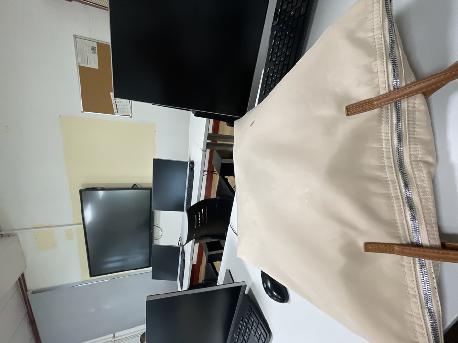 The scene is a computer laboratory or classroom located within an educational or corporate facility in Madrid, Spain. In the immediate foreground, a light beige/tan bag with brown faux leather straps and a silver zipper is centrally positioned on a white desk, partially obscuring a black computer mouse to its left. To the left of the bag, a black computer monitor and keyboard are visible on the same desk. To the right, a similar black monitor and keyboard are partially visible. Further into the room, multiple workstations are arranged in rows on white desks. Each station features a black computer monitor and keyboard, accompanied by a black office chair. One chair is pulled in towards a desk, suggesting recent or imminent use. The walls are painted off-white with visible patches of a lighter yellow or cream color. A large, black flat-screen television or monitor is mounted centrally on the wall in the background. To the right of the mounted screen, a corkboard or bulletin board is affixed to the wall, displaying several documents, one of which appears to be a calendar or schedule. Overhead artificial lighting illuminates the room. No individuals are present in the image.