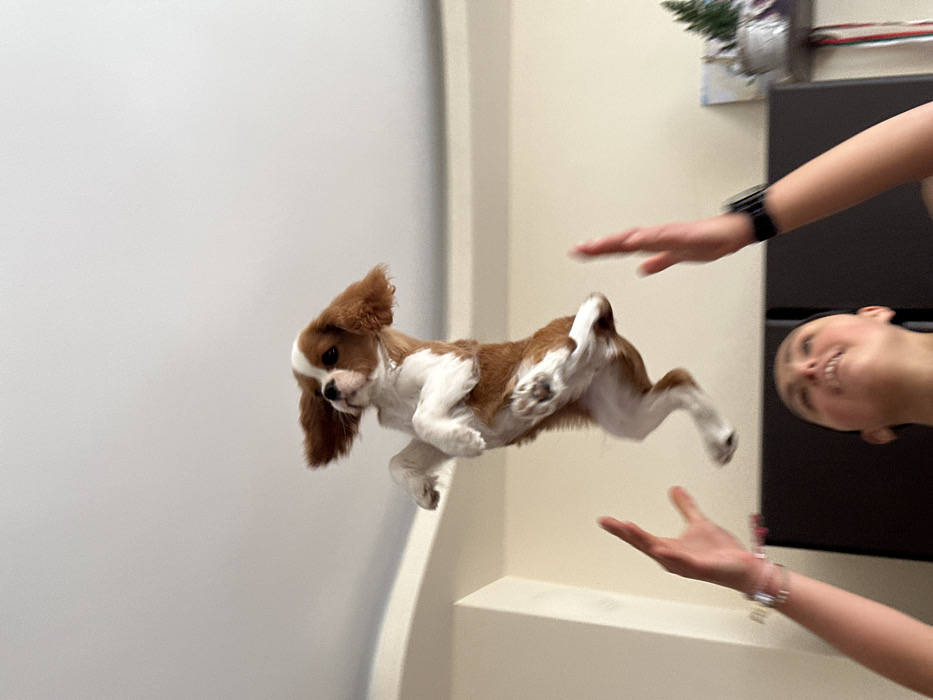 - "The scene, set indoors in Burgas, Bulgaria, captures a small brown and white Cavalier King Charles Spaniel puppy suspended in mid-air above an individual" by FM-IZBAo2, licensed under CC BY 4.0