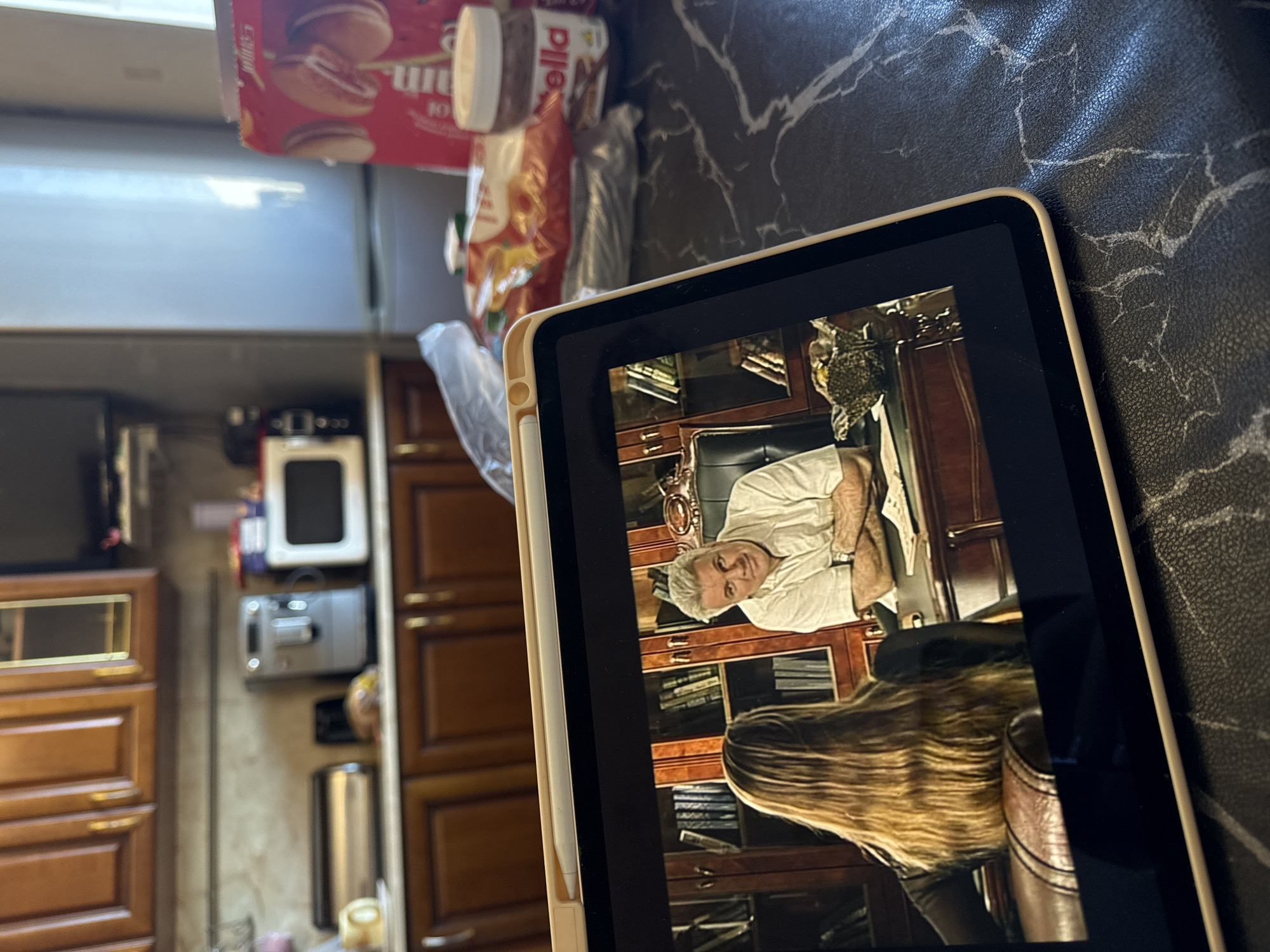 A photograph shows an iPad displaying an image of two people, against a background that includes a kitchen setting. The iPad is tilted slightly to the right, with a white stylus attached to its side. On the screen, one person is sitting in a leather chair, and another person with long blonde hair is standing in front of them. The background of the iPad image features wooden bookshelves. The surrounding physical environment includes kitchen cabinets, a microwave, and snacks such as Nutella and cookies on what appears to be a black marble countertop. The objects around the iPad suggest a home or residential setting. There is no information in the image to verify that this is in Kurovskoye, Russia.