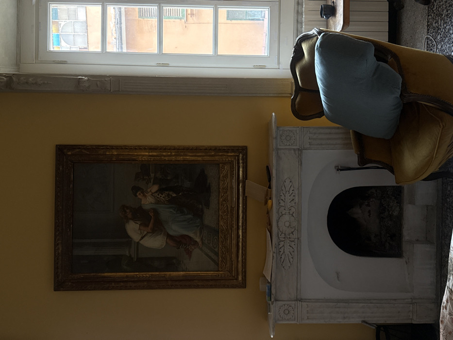 A room interior features a window, a framed artwork, a fireplace, and a chair. The window, located at the top, offers a view of exterior buildings. Below it, an ornate frame encloses a painting depicting two figures in classical attire. To the right is a white, decorative fireplace with a dark interior. A yellow chair with a blue pillow is positioned near the fireplace. The wall is painted a subdued yellow tone.