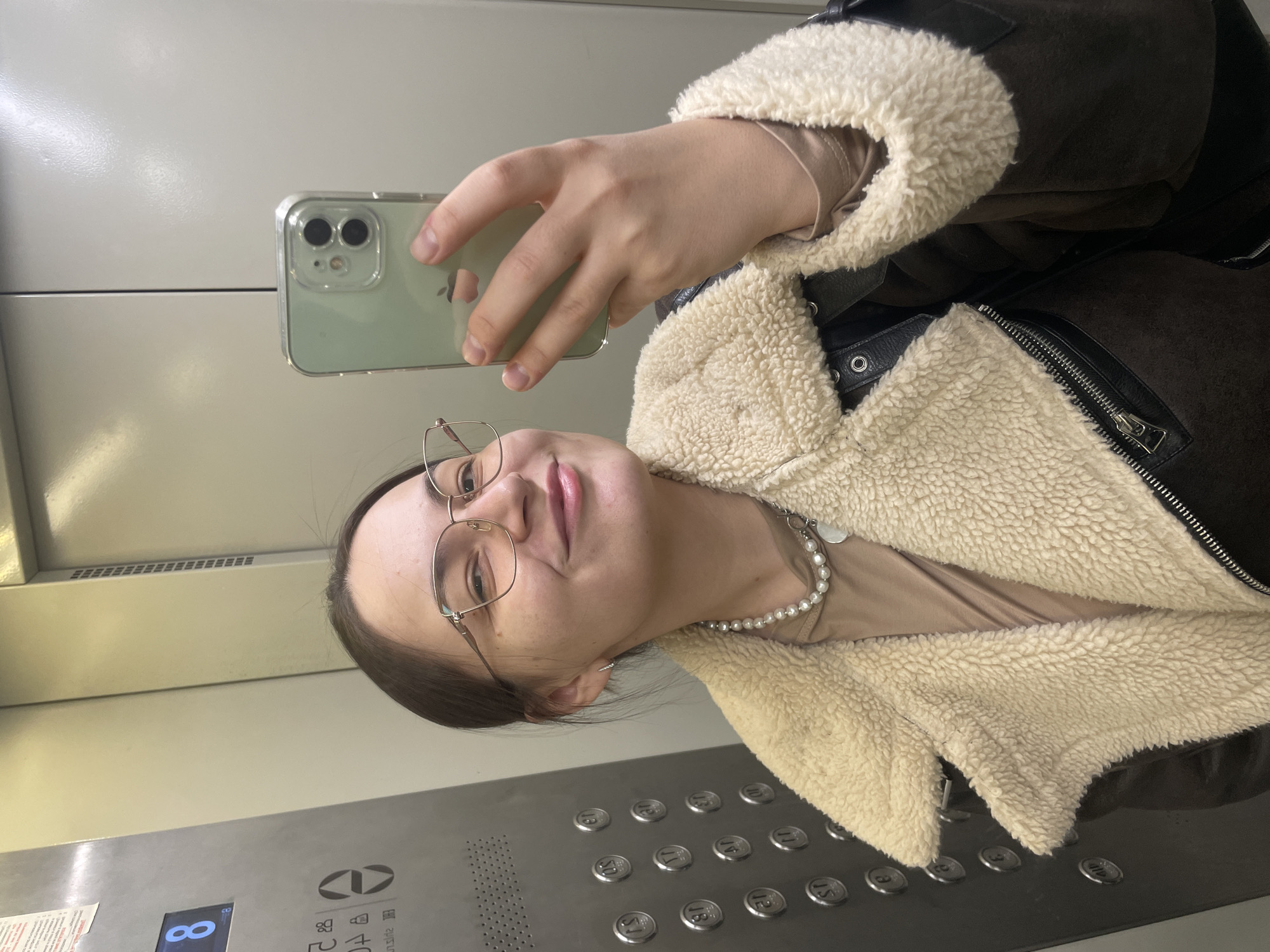 A female subject is depicted in a close-up, waist-up mirror selfie taken inside an elevator. She has dark hair, pulled back, and wears gold-rimmed glasses. Her facial expression is a slight smile. She is wearing a dark brown jacket with cream-colored sherpa lining visible on the collar and interior, over a light brown long-sleeved top. A white pearl necklace with a circular silver-colored pendant adorns her neck. A small silver hoop earring is present in her right ear. The subject holds a light green smartphone, confirmed as an iPhone by the visible Apple logo, encased in a clear protective shell, in her left hand, positioned to capture the reflection. The elevator interior features brushed metal walls. On the left, a control panel displays the digital number "8", indicating the current floor. Below this, an emergency call button, door open/close buttons, and a vertical array of circular metallic floor selection buttons are visible, ranging from "B" (Basement) to "17". A perforated grille is located at the bottom of the panel. A sticker on the upper left section of the panel displays Cyrillic text, including "Балаш", which identifies the location as Balashikha, Russia.