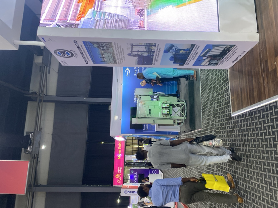 The image displays an indoor exhibition hall, assumed to be in Alaguntan, Nigeria, given the prompt's instruction and "Nigeria Energy" signage within the scene